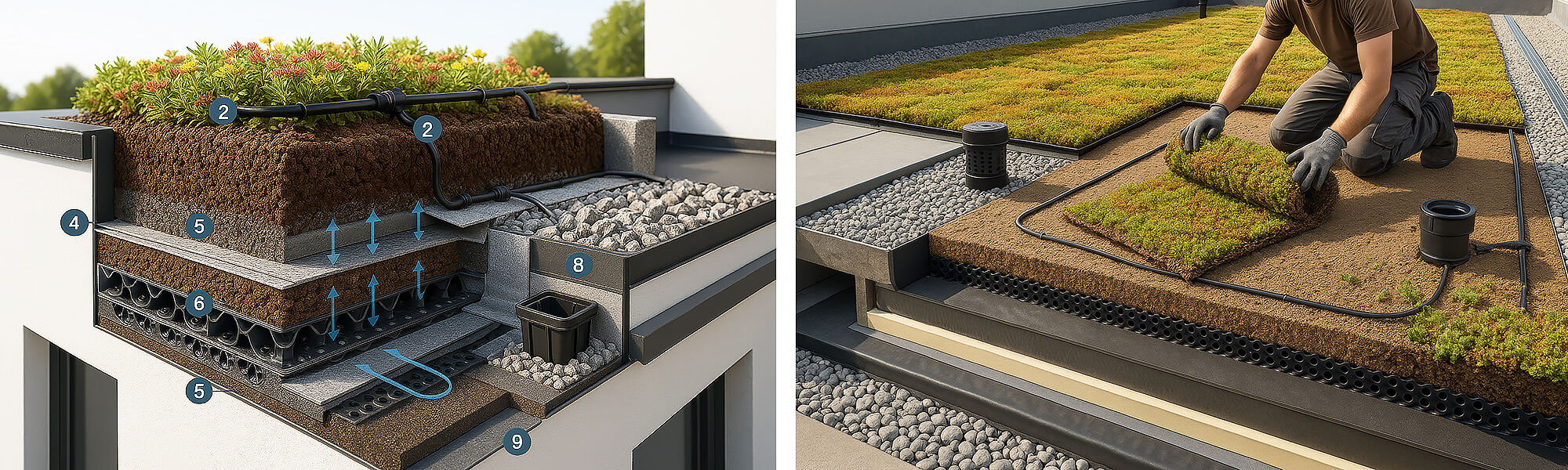 Ein fachgerechter Gründachaufbau umfasst (2) druckkompensiertes Tropfrohr für gleichmäßige Feuchte bei Hitze; (4) Attika-Aufkantung mit Abschlussprofil und wurzelfeste Abdichtung bis Oberkante zum Randschutz; (5) Geotextil-Lagen mit Filtervlies oben und Schutz-/Trennlage unten für saubere Dränage und geschützte Abdichtung; (6) Drän-/Speicherelement als Noppen-/Wabenschicht zum Speichern und Ableiten von Wasser; (8) Kiesrand/Brandriegel mit Revisionsschacht für Wartung, Brandschutz und Kontrolle; (9) Warmdachaufbau von oben nach unten: wurzelsichere Abdichtung → Schutzlage → Dämmung (mit Gefälle) → Dampfsperre → Tragwerk.