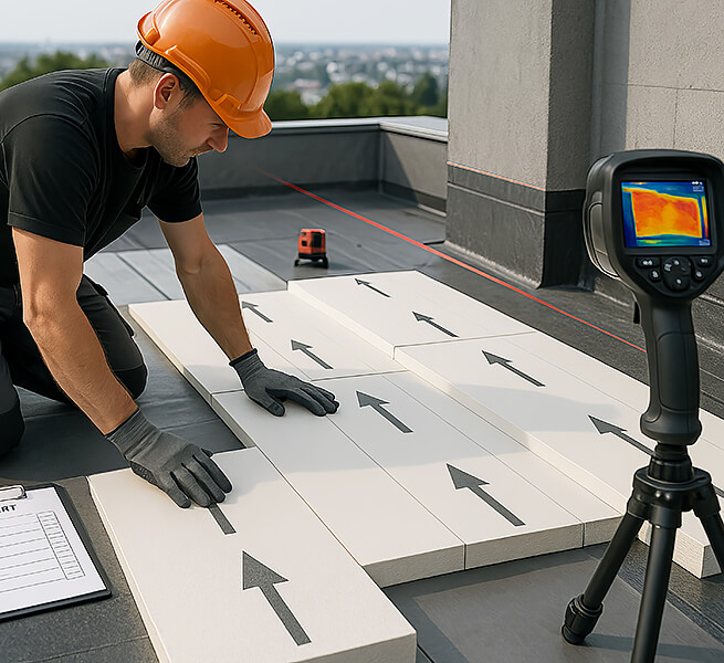 Je nach Nutzung konzipieren wir Warm-, Kaltdach- oder Umkehrdachaufbauten, wählen passende Abdichtungssysteme (Bitumen, Kunststoff- oder EPDM-Bahnen, Flüssigkunststoff) und optimieren Wärmeschutz, Gefälle und Entwässerung. Durchdringungen, Anschlüsse und Aufkantungen werden technisch sauber ausgeführt, damit das Dach in jeder Wetterlage zuverlässig funktioniert.