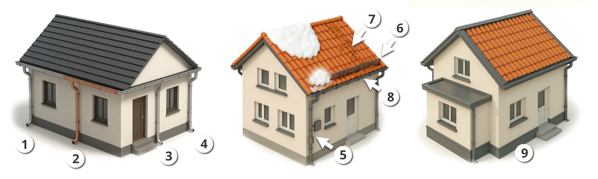 1 Zink: lötbar, bildet Patina, ca. 30–40 Jahre, neutraler Look, nicht mit Kupfer kombinieren. 2 Kupfer: sehr langlebig (50 +), edel, patiniert grün, teuer, nie mit Zink/Alu mischen. 3 Aluminium: leicht, korrosionsfest, farbbeschichtbar, Dehnungsausgleich nötig, ca. 25–40 Jahre. 4 Edelstahl: höchste Beständigkeit, moderner Look, schwerer/teurer, ideal bei hoher Belastung. 5 Fallrohr-Revisionsstück/Laubfang: einfache Reinigung, schützt vor Verstopfung und Nässeschäden. 6 Rinnen-Laubschutz: hält Laub zurück, Wasser läuft ab, weniger Reinigung, weniger Überlaufen. 7 Schneefanggitter: stoppt rutschende Schneetafeln, Schutz für Wege/Rinne; Dimensionierung nach Schneelast und Dachneigung. 8 Trauf-/Rinnendetail: stabile Haken, optional Heizung gegen Eis, sauberer Übergang verhindert Unterläufigkeit. 9 Kant- und Tropfschutz: Abdeckungen/Tropfbleche leiten Wasser von der Fassade weg, schützen Putz und Sockel, verbessern Optik und Haltbarkeit.