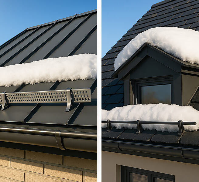 • Schutz & Komfort: Laubfang, Revisionsöffnungen, Schneefang, optionale Rinnenheizung