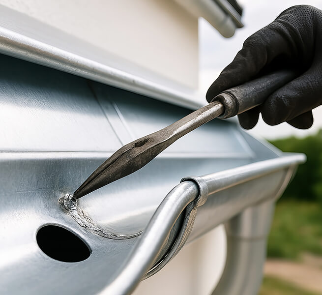 Unsere Klempnerarbeiten verbinden Handwerkstradition mit moderner Fertigung. Ob Stehfalzbahnen für Gauben und Flachdachaufkantungen, detailgenaue Kehlen, hochwertige Ortgang- und Tropfkantenbleche oder verdeckte Entwässerungen: Jede Kantung, jede Löt- bzw. Falzverbindung und jede Dehnungszone ist sauber ausgeführt. Wir achten auf Materialtrennung gegen Kontaktkorrosion, auf thermische Längenänderungen mit Schiebe- und Dehnungselementen, auf geräuschgedämmte Rohrschellen und auf optische Details wie verdeckte Befestigungen. Das Ergebnis: dauerhaft dichte Anschlüsse an Kamin, Dachfenster und Durchdringungen – sturmsicher, regendicht und formschön.