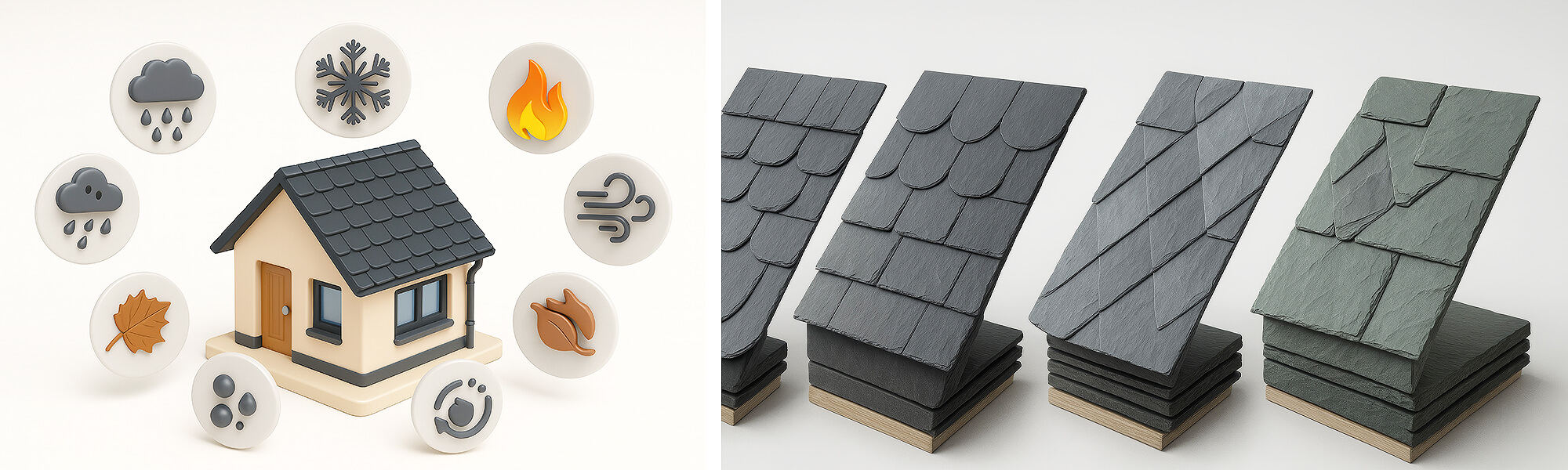 Die Grafik Links zeigt ein Haus mit geneigtem Dach, umgeben von Icons für Regen, Schnee, Wind, Feuer, Hagel, Laub und Wasserführung. Sie verdeutlicht: Ein Dach schützt nur dann zuverlässig, wenn Deckung, Unterkonstruktion, Hinterlüftung, Befestigung, Entwässerung und Spenglerdetails präzise zusammenspielen. So bleibt das Gebäude bei jeder Witterung dauerhaft dicht und sicher. Rechts sehen Sie Musterflächen aus Naturschiefer – unterschiedliche Deckarten auf geneigten Tafeln (u. a. Altdeutsche/Schuppen-, Rechteck-Doppeldeckung, Spitzwinkel/Universal sowie Wilde Deckung). Die Präsentation zeigt Optik, Fugenbild und Materialstärke im direkten Vergleich und hilft bei der Auswahl von Stil, Technik und Budget.