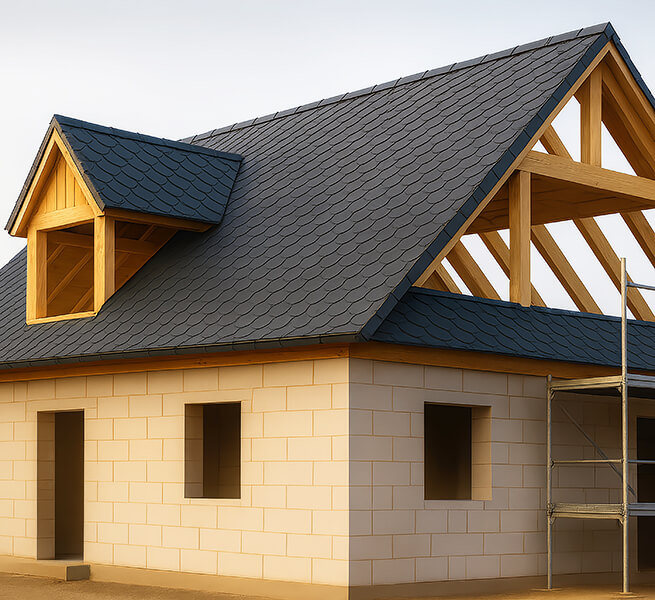 Schiefer eignet sich nicht nur fürs Hauptdach, sondern auch für Gauben, Ortgänge, Traufen und Fassadenbekleidungen. Unterschiedliche Deckarten und Formate eröffnen gestalterische Spielräume – von sachlich-ruhig bis handwerklich-plastisch. Auf Wunsch integrieren wir Dachfenster, Schneeschutz, Entwässerung in Zink/Kupfer und bereiten Ihr Dach optional für spätere Techniknachrüstungen vor.