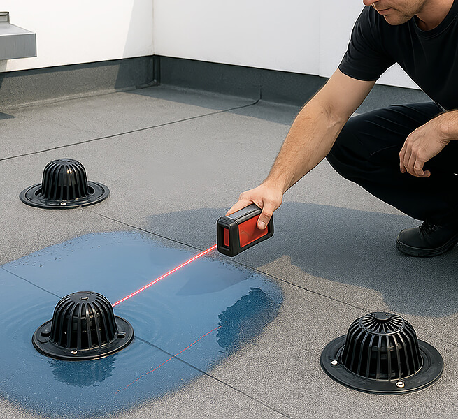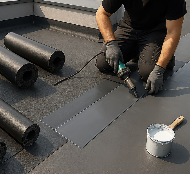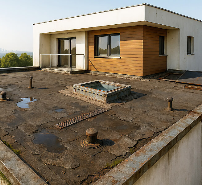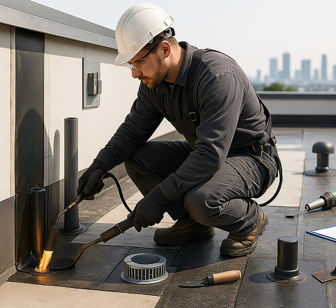 Je nach Nutzung konzipieren wir Warm-, Kaltdach- oder Umkehrdachaufbauten, wählen passende Abdichtungssysteme (Bitumen, Kunststoff- oder EPDM-Bahnen, Flüssigkunststoff) und optimieren Wärmeschutz, Gefälle und Entwässerung. Durchdringungen, Anschlüsse und Aufkantungen werden technisch sauber ausgeführt, damit das Dach in jeder Wetterlage zuverlässig funktioniert.