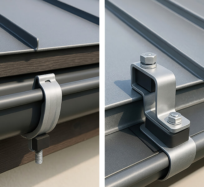 1 Zink: lötbar, bildet Patina, ca. 30–40 Jahre, neutraler Look, nicht mit Kupfer kombinieren. 2 Kupfer: sehr langlebig (50 +), edel, patiniert grün, teuer, nie mit Zink/Alu mischen. 3 Aluminium: leicht, korrosionsfest, farbbeschichtbar, Dehnungsausgleich nötig, ca. 25–40 Jahre. 4 Edelstahl: höchste Beständigkeit, moderner Look, schwerer/teurer, ideal bei hoher Belastung. 5 Fallrohr-Revisionsstück/Laubfang: einfache Reinigung, schützt vor Verstopfung und Nässeschäden. 6 Rinnen-Laubschutz: hält Laub zurück, Wasser läuft ab, weniger Reinigung, weniger Überlaufen. 7 Schneefanggitter: stoppt rutschende Schneetafeln, Schutz für Wege/Rinne; Dimensionierung nach Schneelast und Dachneigung. 8 Trauf-/Rinnendetail: stabile Haken, optional Heizung gegen Eis, sauberer Übergang verhindert Unterläufigkeit. 9 Kant- und Tropfschutz: Abdeckungen/Tropfbleche leiten Wasser von der Fassade weg, schützen Putz und Sockel, verbessern Optik und Haltbarkeit.
