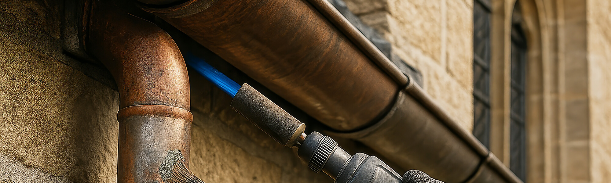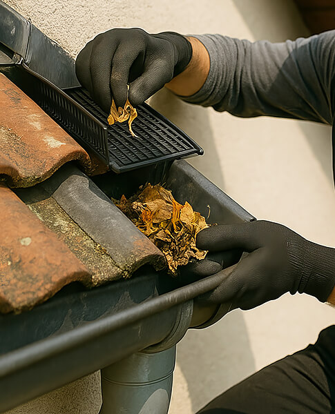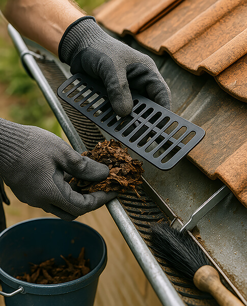 Sicherer Wasserablauf: Gereinigte Rinnen/Fallrohre verhindern Rückstau und Feuchteschäden.